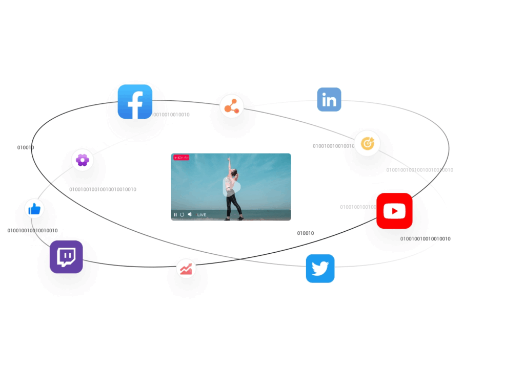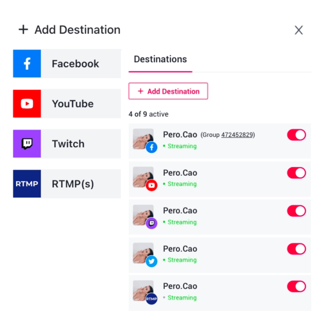 Choose destinations where you want your viewers to watch. You can select up to 15 destinations simultaneously including Facebook, YouTube, Twitch, your own website and more.