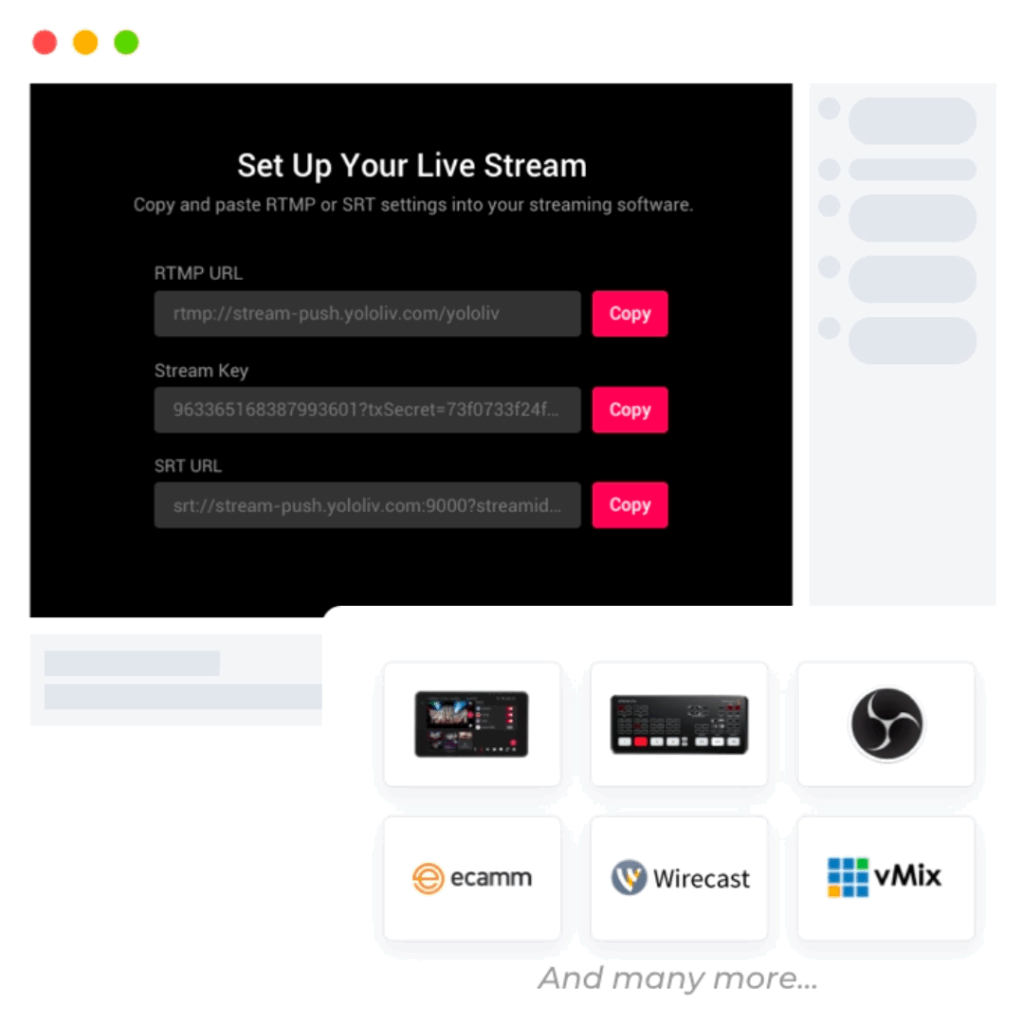 YoloCast 24/7 live stream works with all streaming hardware encoders, software encoders and live streaming apps on the market. Simply copy and paste the Key and URL, your 24/7 live stream is ready to go.
