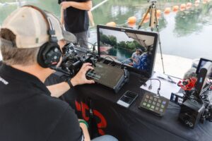 The YoloBox Extreme handled input from four cameras simultaneously: a Sony FX6 chasing boats as the primary manned camera, an FX3 covering the backside of the chute as a wide static shot, an A1 locked on the emcee for live commentary, and an A1II rail-mounted to capture boats as they came through the chute. That’s a four-camera live production managed from a single, portable device—on the edge of a river, in threatening weather.
