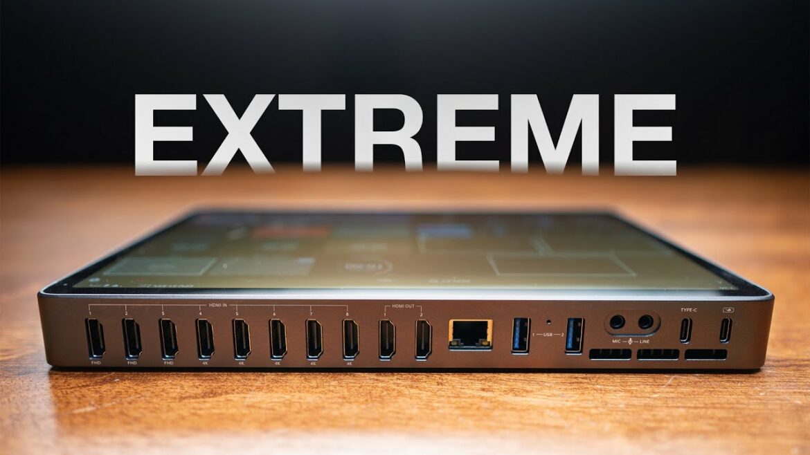 This thing has eight HDMI inputs. I’m going to plug something to all of them. Eight HDMI ports on a mobile device this size sounds a bit extreme, but it’s actually 10 HDMI ports if you count the two outputs. The word extreme is literally part of the product’s name cuz we are looking at the YoloBox Extreme.
