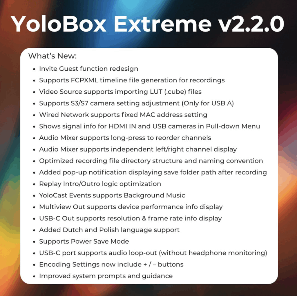 We’re excited to share the latest update for YoloBox Extreme — version v2.2.0 — with improvements and new features designed to make your multi-camera live production easier, more powerful, and more flexible.