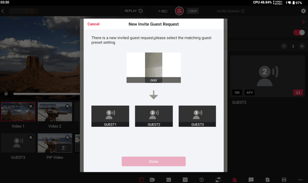 We’ve enhanced the Invite Guest workflow so remote contributors are easier to bring into your live production. You can first set up the video source slots for the guests, then pre‑set multiview, overlays, etc. Then just wait for the guests to join, and arrange everything as you wish.