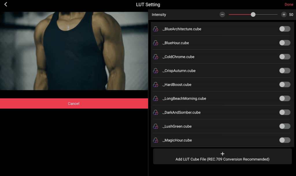 - LUT support for professional color grading