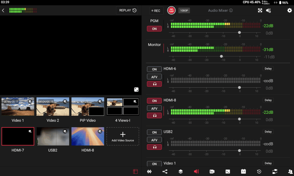 The audio mixer has also been upgraded. YoloBox Extreme now supports dual-channel volume level display, making it much easier to monitor audio levels in real time. You can also reorder the audio channels as you want.